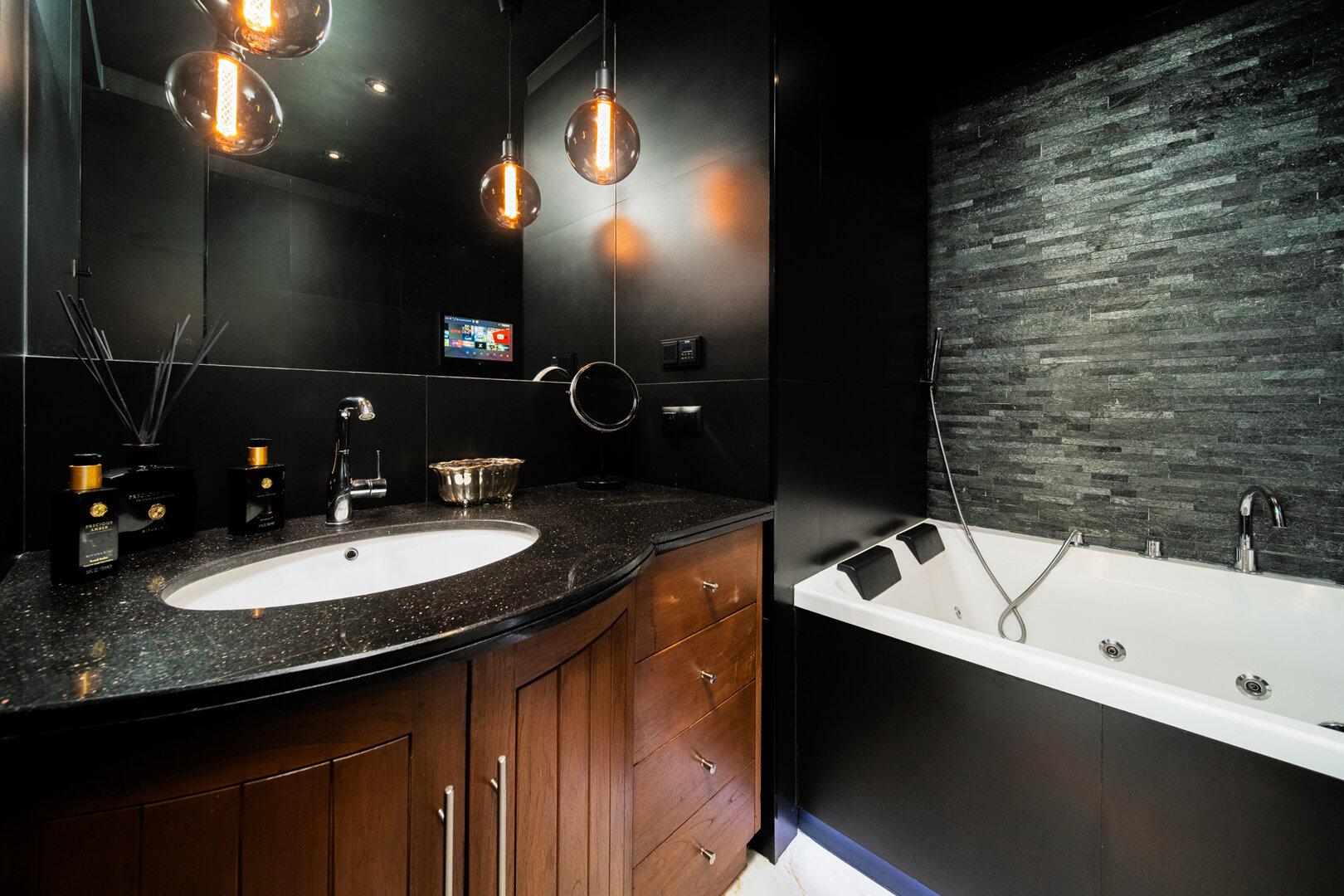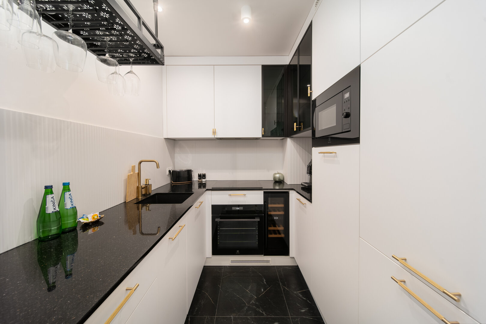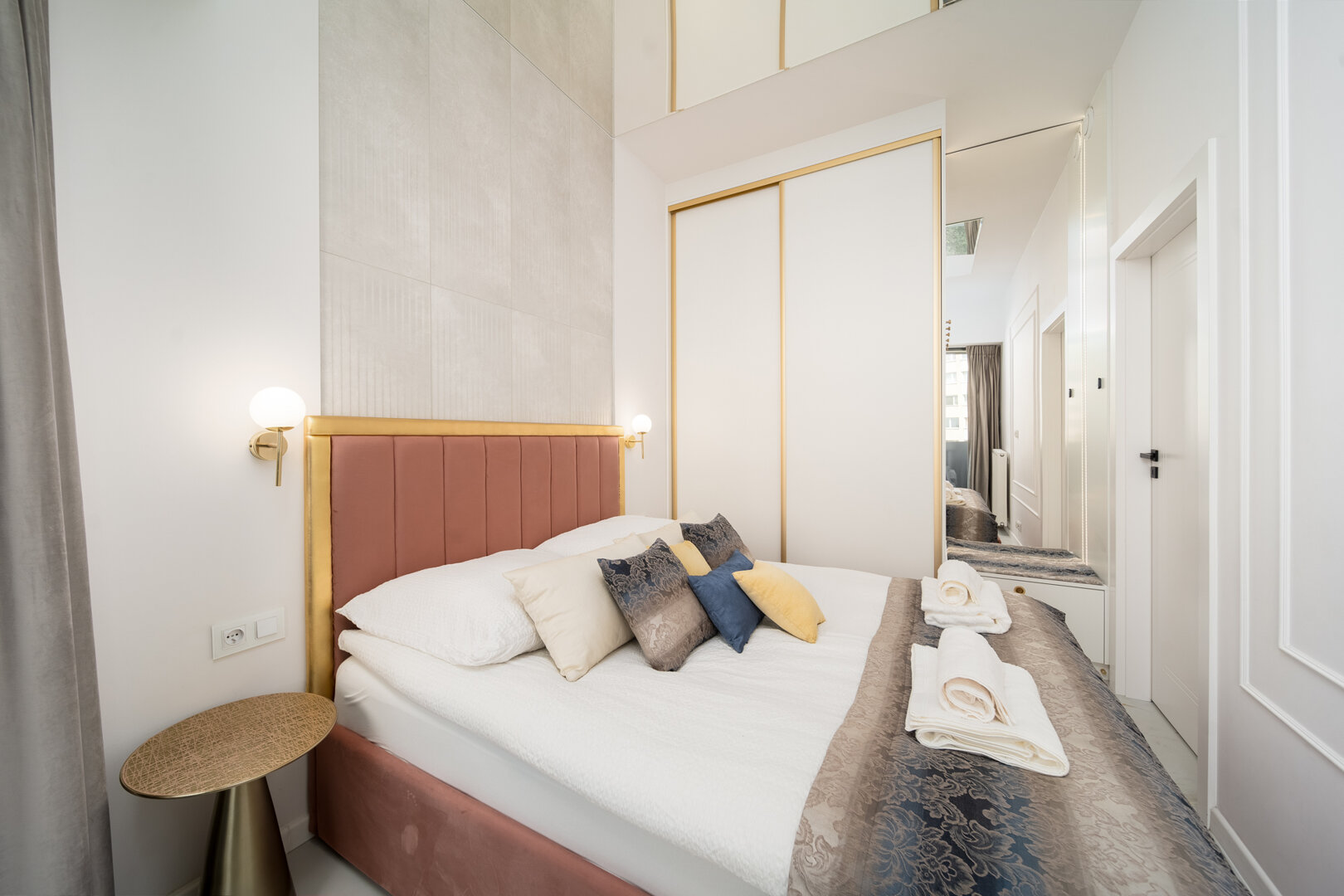 Apartament składa się z salonu z aneksem kuchennym, sypialni z podwójnym łóżkiem oraz łazienki z wanną z hyrdomasażem. Do dyspozycji naszych klientów jest także duży, zabudowany balkon z widokiem na okoliczną zabudowę. Mieszkanie wyposażone jest w niezbędny sprzęt AGD (czajnik elektryczny, ekspres do kawy, płyta indukcyjna, zmywarka, lodówka i pralka), przybory łazienkowe i kuchenne. W salonie znajduje się telewizor z dostępem do telewizji kablowej. Apartament posiada własną bezpłatną sieć Wi-Fi. Nasi goście bez dodatkowych opłat mogą w pełni korzystać z pięknego krytego basenu, saun oraz jacuzzi, które znajdują się na 1-szym piętrze. Do dyspozycji jest również taras na 27 piętrze z zapierającym dech w piersiach widokiem na panoramę miasta. Goście, którzy do naszego obiektu przyjadą samochodem mają możliwość wykupienia miejsca parkingowego w garażu podziemnym. Serdecznie zapraszamy.